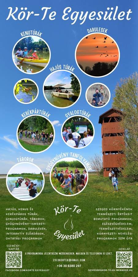 Tavasszal gyógynövényismereti túrák, kerékpáros kirándulások, nyáron kenus, sárkányhajós és hajós programok a Tiszán és Mártélyon. Az éjszakai túrákat a hullócsillagok (a Perseidák) érkezéséhez időzítjük augusztusban. Az őszi időszak legszebb látványossága a darvak behúzása a szegedi Fehér-tónál. Az október-decemberi időszakban túravezetőnk 25 éve szervez daruleseket ennek bemutatására. Téli túráink a közeli védett tavak rejtett zugait fedezik fel.