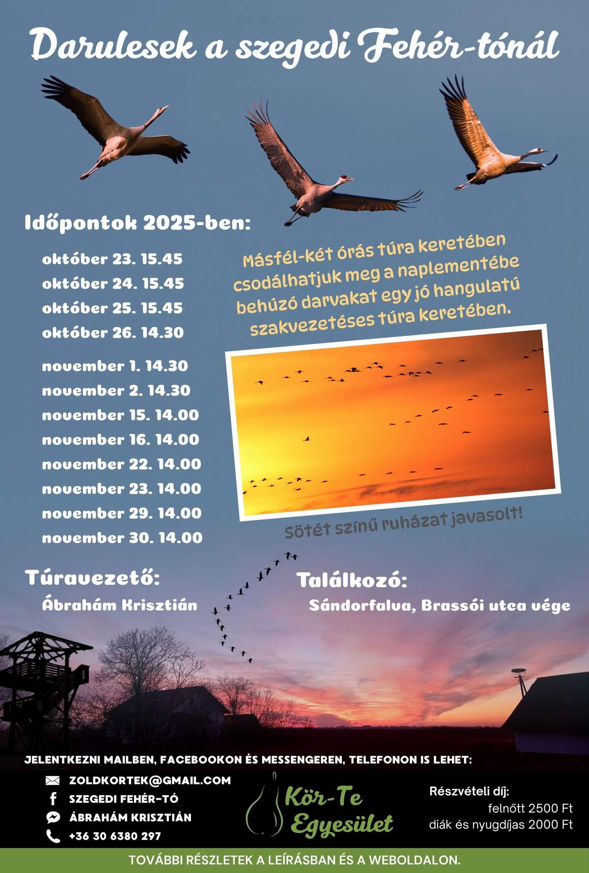 Információk, bejelentkezés messenger üzenetben (Kör-Te Egyesület), vagy mailben a zoldkortek@gmail.com címen, vagy telefonon 30/638-0297. Túravezetőnk Ábrahám Krisztián; természeti túrák, darulesek, gyógynövénytúrák több mint 25 éve. SÖTÉT SZÍNŰ RUHA JAVASOLT! Gumicsizmára nincs szükség, inkább túracipő, bármilyen kényelmes cipő. Füves ösvényeken sétálunk, a túra során használt utak akár eső után is jól járhatóak.